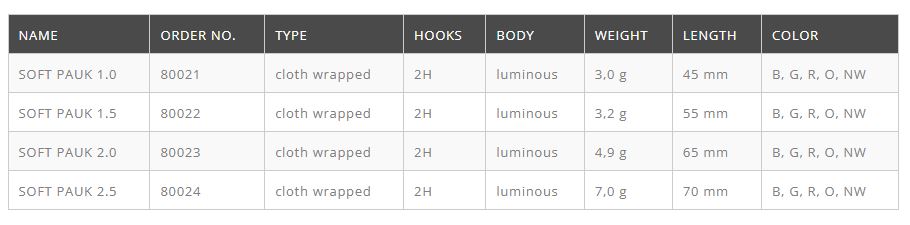 Although very dangerous and posion fish, pauk (weever) is very often and popular squid prey. It can be found on sand bottoms. We are offering it in 5 different colors.