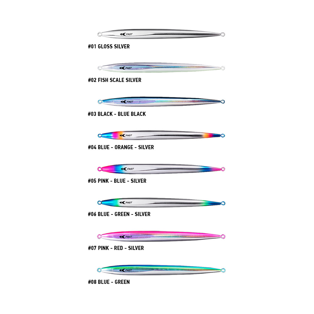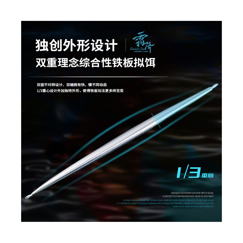 A comprehensive metal lure with original shape design. Two asymmetrical ends provide a speed and slow dynamics. 1:3 center of gravity and special shape make the jigging fishing more varied. Wide and round end down for high current speed, high activity and long distance search. The metal bait can sink quickly and jig lightly. Slow thin and sharp end down for slow current speed, low activity and aimed water search. The metal bait can move in multiple positions.