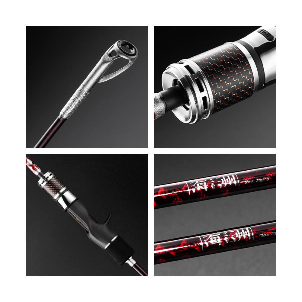 Haiz Series Hollow Slow Jigging Rod. Thanks to the high tonnage carbon blank, Fuji Alconite guides and lightweight Fuji reel seat, the whole rod is light enough for a long-time fishing. KSEH series is hollow with 30T and 40T carbon cloth wrapped. Hollow KSEH series adopt 30T carbon cloth and outer is wrapped by 40T carbon cloth. The hollow blank makes the rod easier to hold. The SSEH series are solid. The solid 30T carbon blank with well-adjusted taper can reduce the use of unnecessary material to make the whole rod lighter. The blank made of high tonnage carbon fiber has a better conductivity. The Fuji guides adopted can effectively reduce the friction between fishing line and rod. Meanwhile, the 37 action ensures a high sensitivity. As a result, the bite signal can quickly transmitted to the angler to better control the rod. The scientific distribution of carbon fiber can greatly improve the rod strength, which helps to quick get the fish back.KSEH is a hollow blank with 40T carbon cloth wrapped, which can effectively reduce the anti-shock force of the blank caused by rebound. Full Fuji Alconite guides have the advantages of light weight, high strength, good wear resistance and strong heat dissipation, which can greatly reduce the wear and tear caused by gravity or long-time operation. The comfortable and durable Fuji reel seat is non-slip, firm and strong. The X45° crossed inverse fiber in the ferrule guarantees an excellent performance in torsion resistance, shock and multi-angle impact resistance. The vacuum seamless joint makes it easier to pull out and insert the rod tip. The advanced translucent ruby red painting retains the original vision and touch feeling of the carbon belt, and fully shows the texture of decorative cloth under different light. The hollow metal fortresslike reel seat cap is more novel and textured.