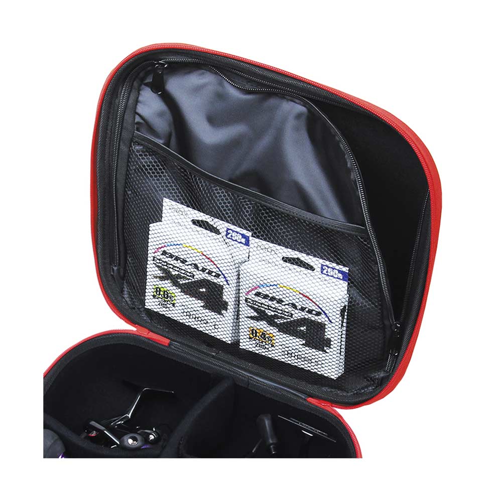 Θήκη μεταφοράς μηχανισμών από την Prox. Διαθέτει ευρύχωρο εσωτερικό με 6 μεταβαλλόμενες θέσεις με σκρατς, για μηχανισμούς, μπομπίνες κτλ. Κατασκευασμένη από σκληρό εξωτερικό υλικό ενώ διαθέτει και σκληρό φερμουάρ, ενώ εσωτερικά διαθέτει χονδρό αφρολέξ για πλήρη προστασία καθώς και βελούδινη εσωτερική επένδυση . Τα εσωτερικά διαχωριστικά διατηρούν τα αντικείμενά σας ξεχωριστά και ασφαλή μεταξύ τους. Στο εσωτερικό διαθέτει θήκη με φερμουάρ ενώ η λαβή μεταφοράς θα σας βοηθήσει να μεταφέρετε με άνεση την θήκη αυτή.